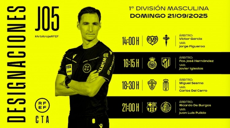 9月20日讯 今天,西班牙足协在官网公布了周日四场西甲比赛的裁判员名单,巴列卡诺VS塞尔塔 主裁判:维克托-加西亚,VA...