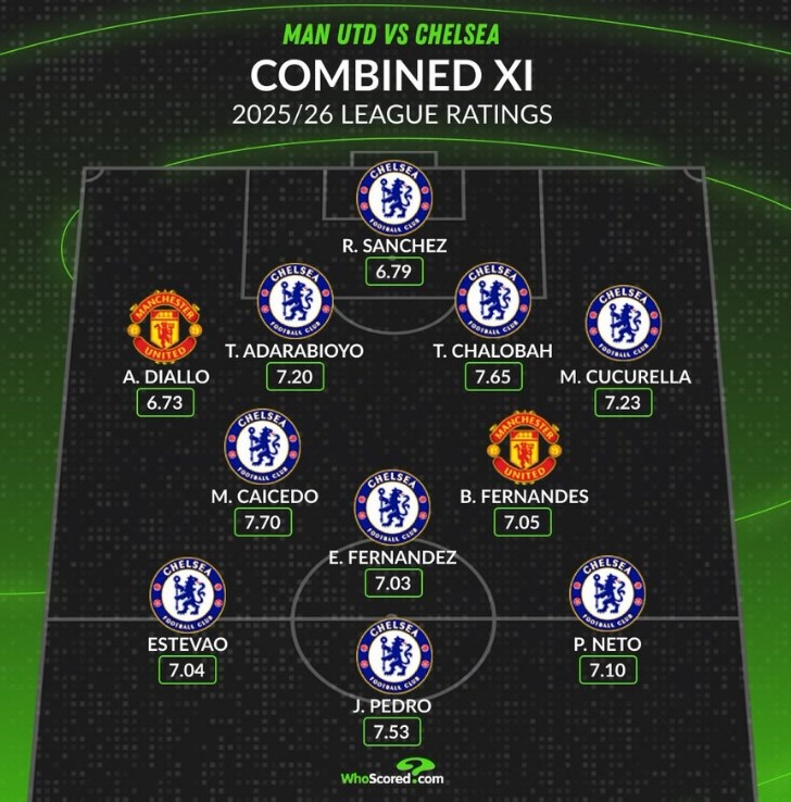 Whoscored评曼联+切尔西本赛季评分最高阵:佩德罗领衔蓝军9人