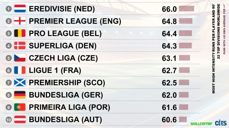 9月20日讯 CIES盘点各联赛球员平均高强度跑动数据,荷甲第一。(高强度跑动定义:>20公里/小时,且持续>...