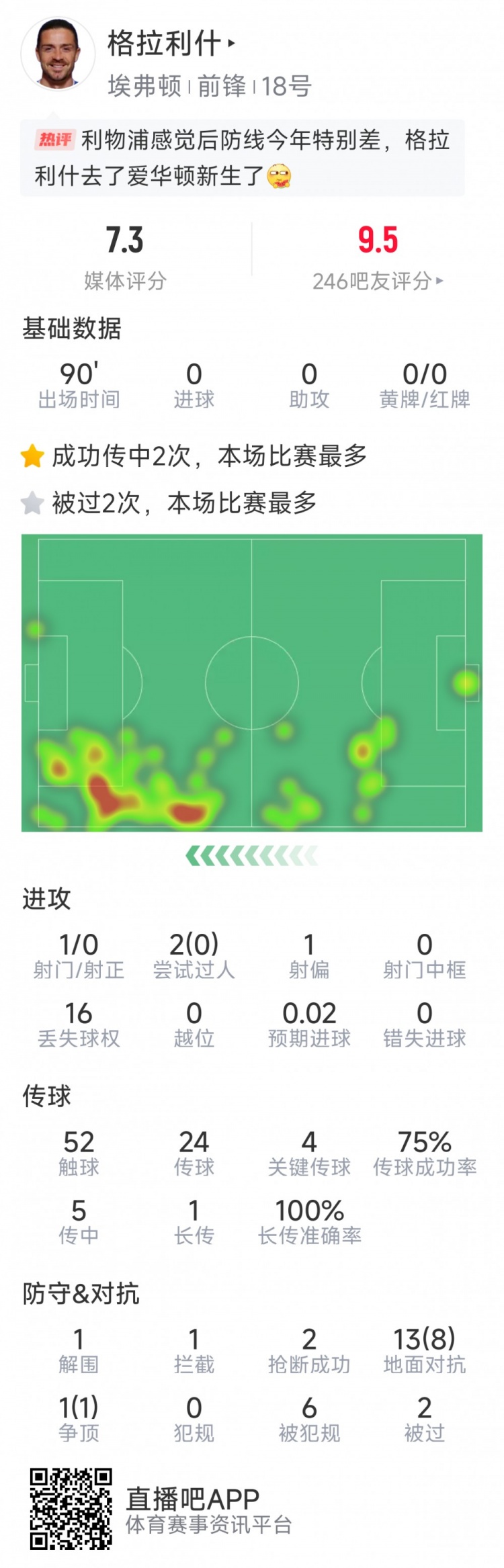 9月20日讯 在本轮英超,利物浦2-1击败埃弗顿。以下为格拉利什本场数据:比赛时间90分钟1次射门0射正2次过人0成功5...