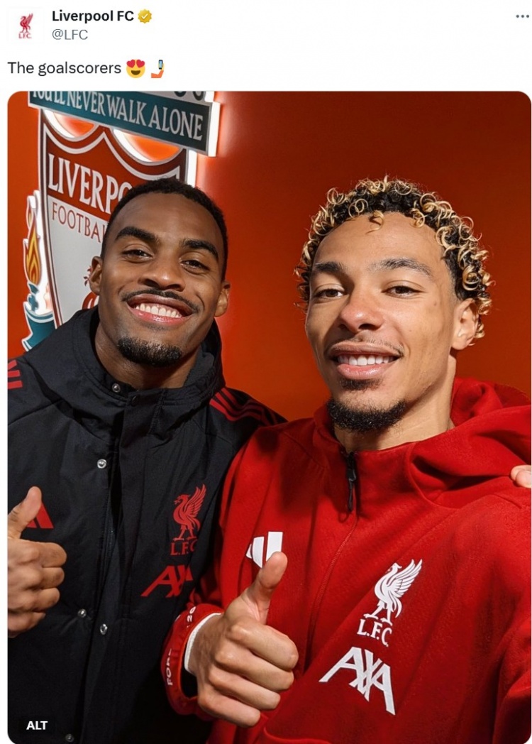 各建一功!利物浦官推晒赫拉芬贝赫、埃基蒂克赛后自拍合影