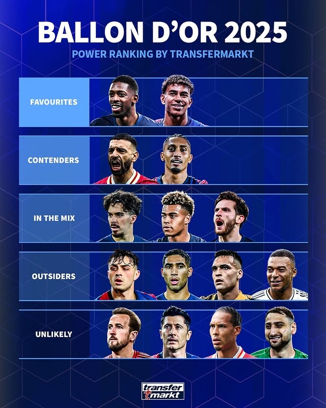 德转金球实力排名:热门:登贝莱、亚马尔有力竞争者:萨拉赫、拉菲尼亚潜在竞争者:维蒂尼亚、杜埃、克瓦拉茨赫利亚非热门:佩德...