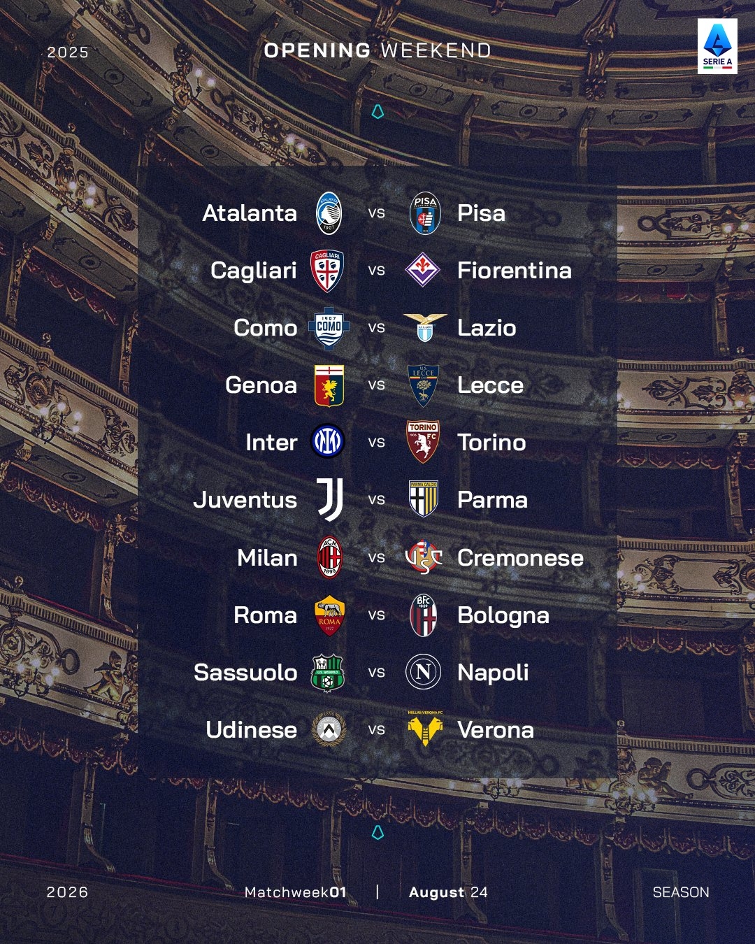 2025-26赛季意甲首轮对阵:国米主场对都灵,那不勒斯客战萨索洛