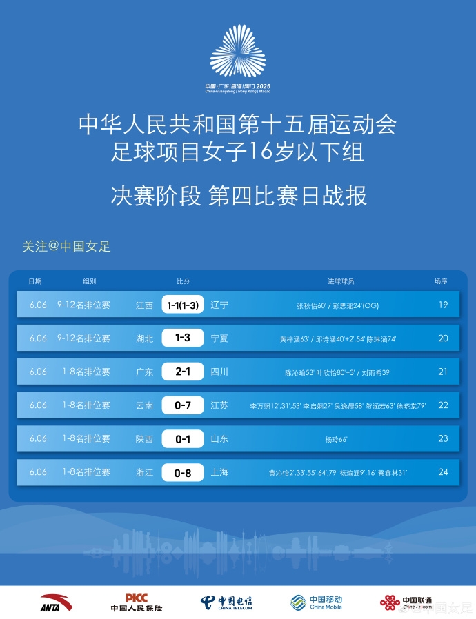 中华人民共和国第十五届运动会足球项目 女子十六岁以下组 决赛第四比赛日战报及第五轮赛程...