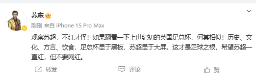 06月06日讯 今日,著名解说员苏东在社媒发文,表示苏超的发展与英国足总杯的发展十分相似。苏东:“观察苏超,不红才怪!如...