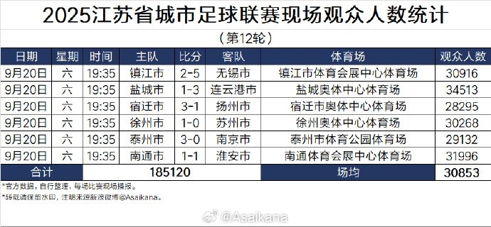 江苏联第12人现场观众人数:总计185120人,场均30853人