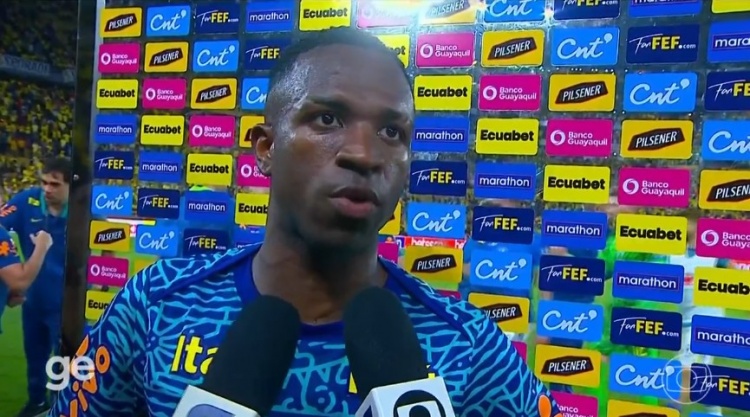 6月6日讯 南美世预赛第15轮,安切洛蒂执教巴西队首秀,客场0-0闷平厄瓜多尔。赛后,维尼修斯接受采访表示:“我对安切洛...