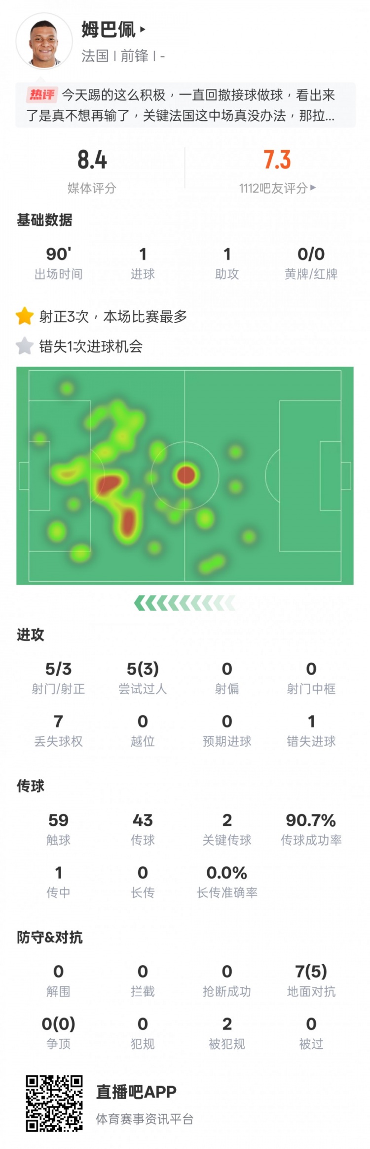 已尽力!姆巴佩本场数据:传射建功+3过人成功2关键传球,评分8.4