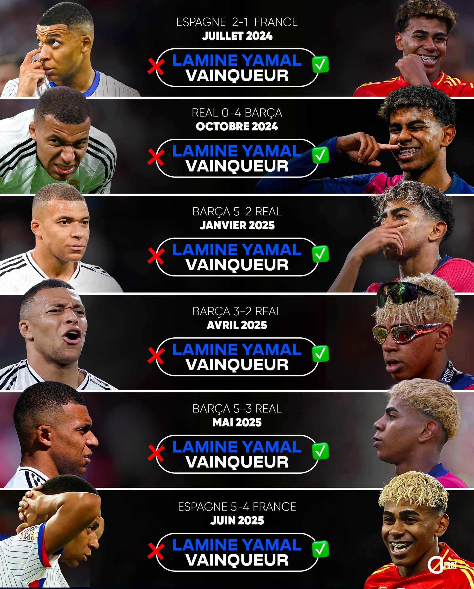 姆总噩梦😖亚马尔各赛事对姆巴佩6连杀!俱乐部4场国家队2场