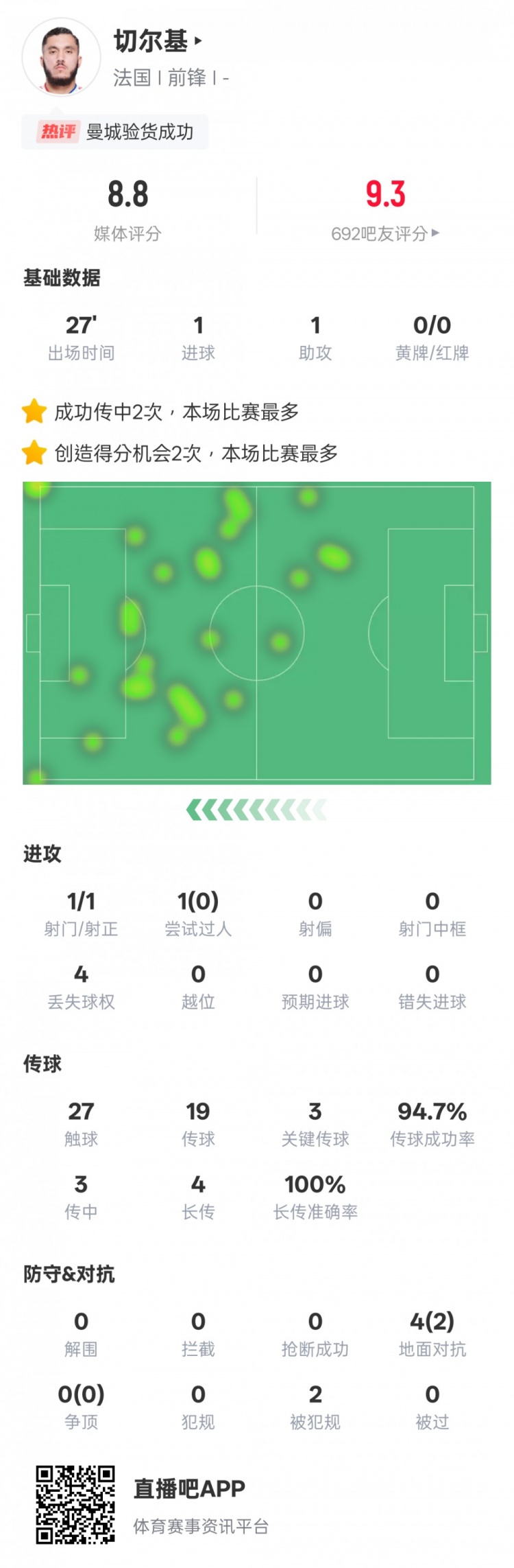 曼城验货!切尔基本场数据:传射建功+3关键传球,评分8.8