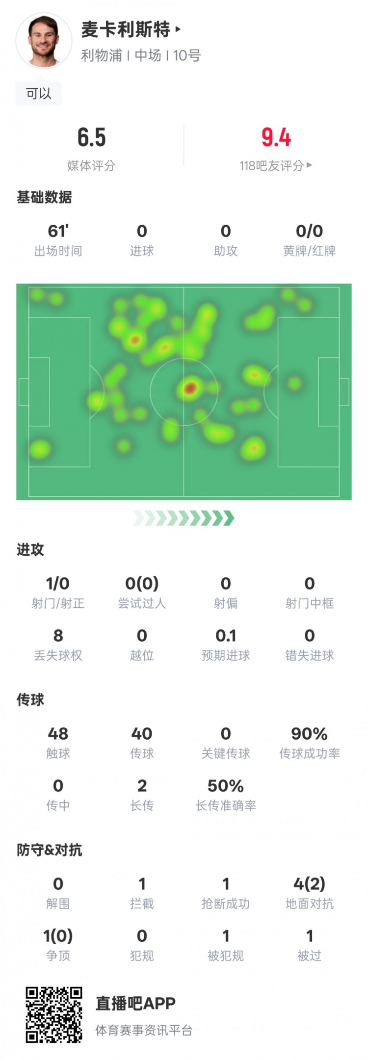 麦卡利斯特本场比赛数据:传球成功率90%+1拦截1抢断,评分6.5