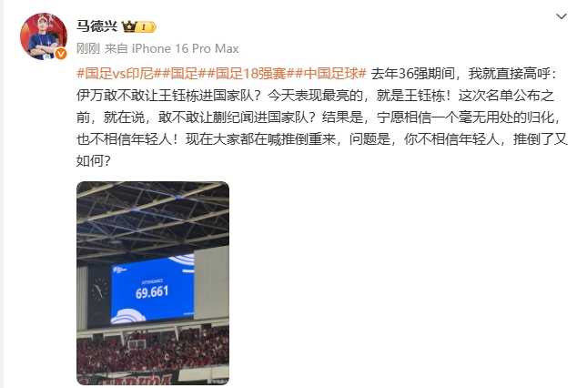 06月06日讯 国足不敌印尼,无缘世界杯,赛后,记者马德兴发文。马德兴:去年36强期间,我就直接高呼:伊万敢不敢让王钰栋...