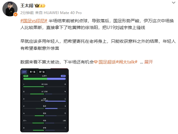 06月05日讯 今日,国足迎世预赛生死战,客场对阵印尼,目前国足0-1落后。媒体人“王太闹”在社媒评国足半场换人。王太闹...