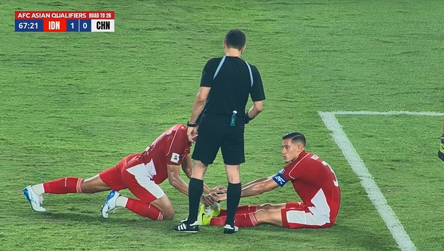印尼球员再次倒地!比赛第67分钟,印尼球员疑似抽筋倒地