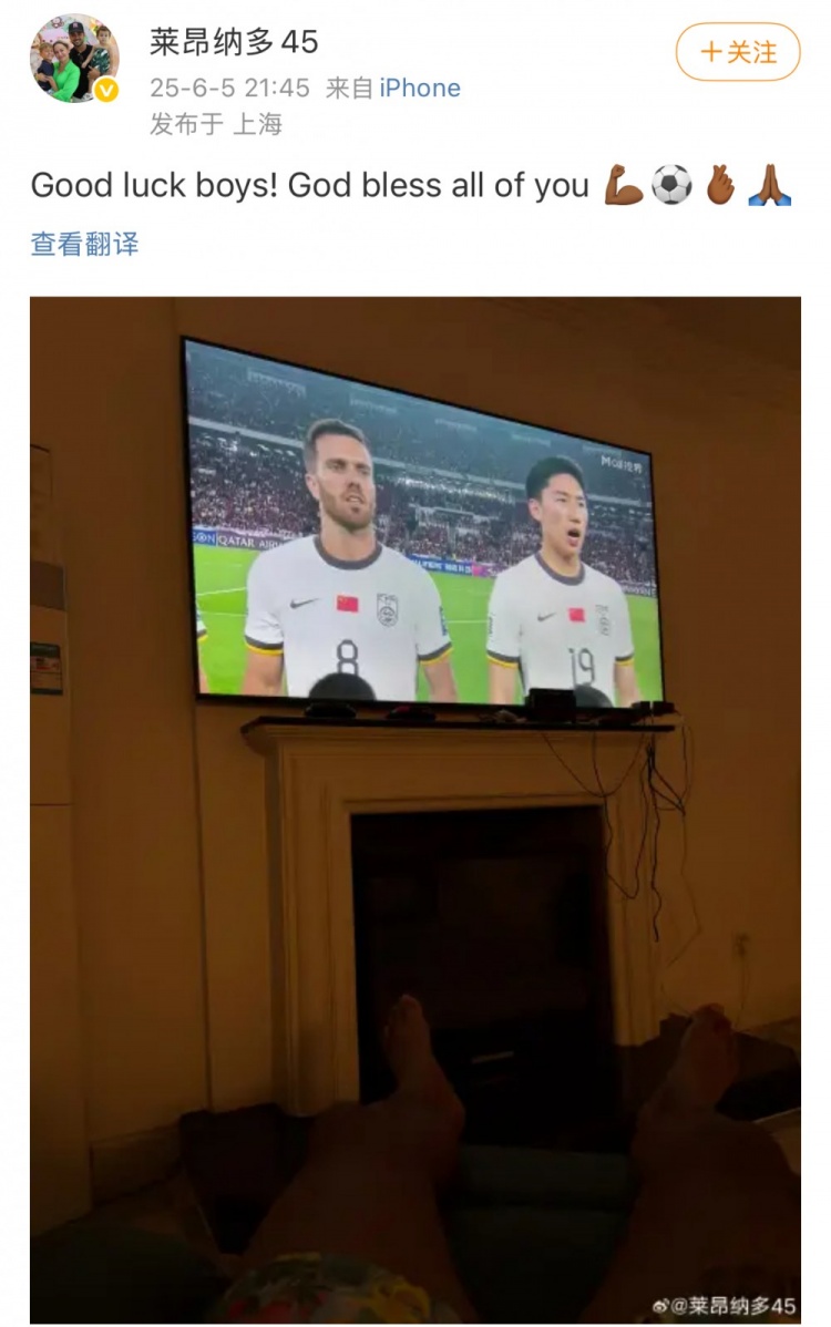 海港外援莱昂纳多晒观战国足照:祝你们好运,上帝会保佑你们的