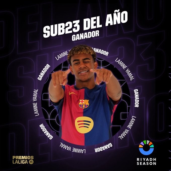 6月5日讯 西甲官方宣布,17岁的巴萨攻击手亚马尔当选本赛季西甲最佳U23球员。本赛季,亚马尔为巴萨出战55场比赛打入1...