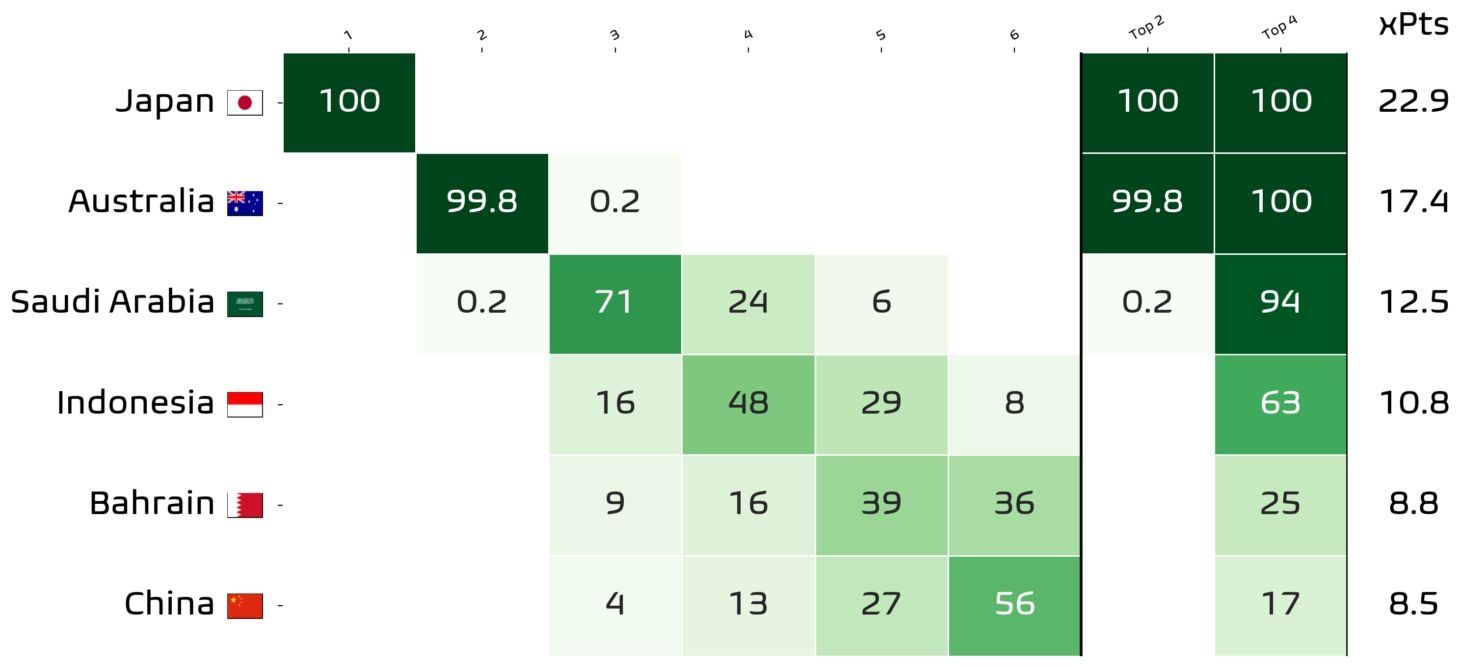 日本100%澳大利亚99.8%直通世界杯,国足赛前仅17%概率进前四