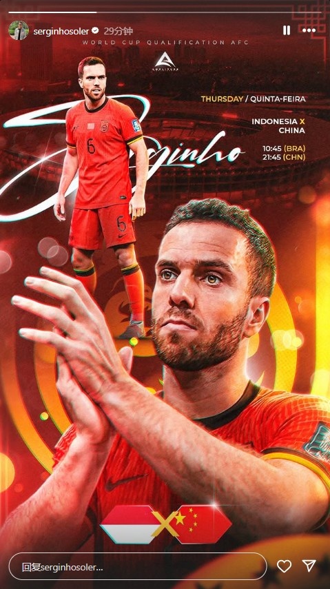 今晚首次首发?塞尔吉尼奥发布国足vs印尼的个人海报