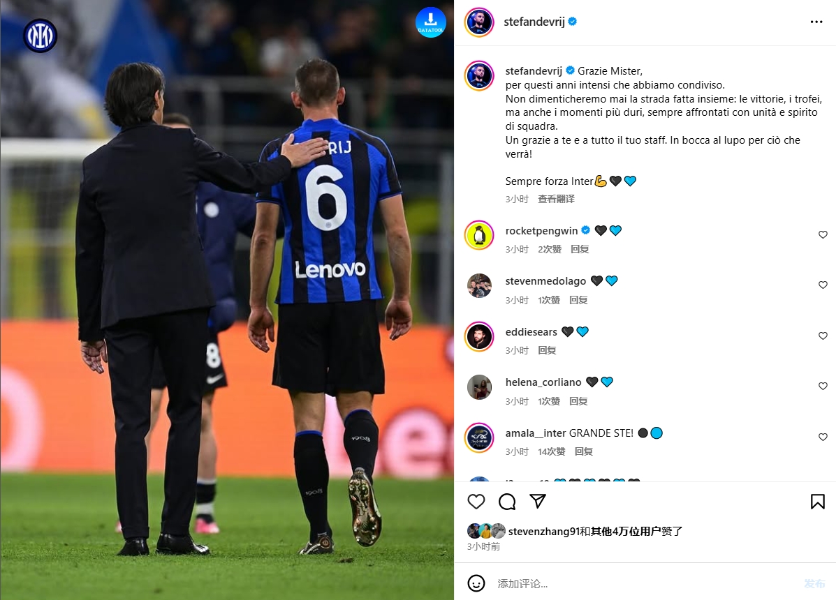 6月5日讯 小因扎吉已经正式离开国米,德弗里更新社交媒体,发文告别了小因。德弗里:“谢谢您,教练先生!感激我们一同度过...