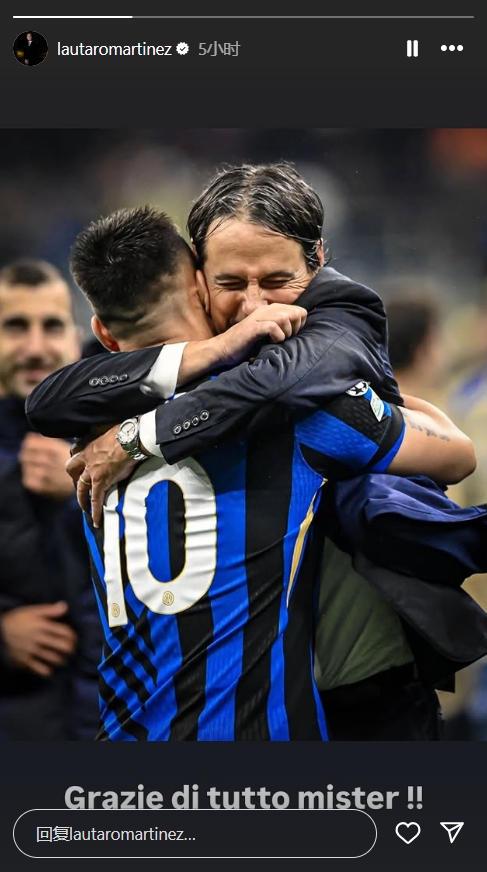 6月5日讯 此前国米官宣,小因扎吉离任。劳塔罗在社媒晒出与小因扎吉合照向教练告别,劳塔罗写道:感谢您所做的一切,教练!!...