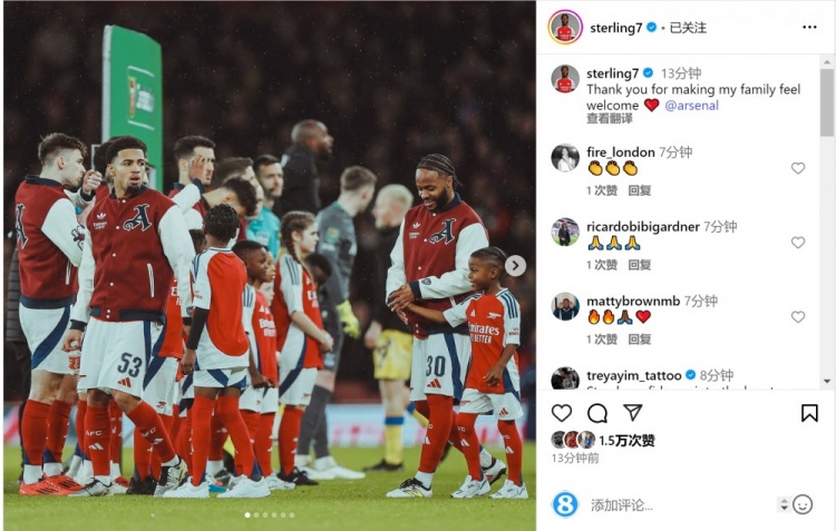 斯特林社媒致谢阿森纳:感谢你们让我的家人感受到温暖的欢迎