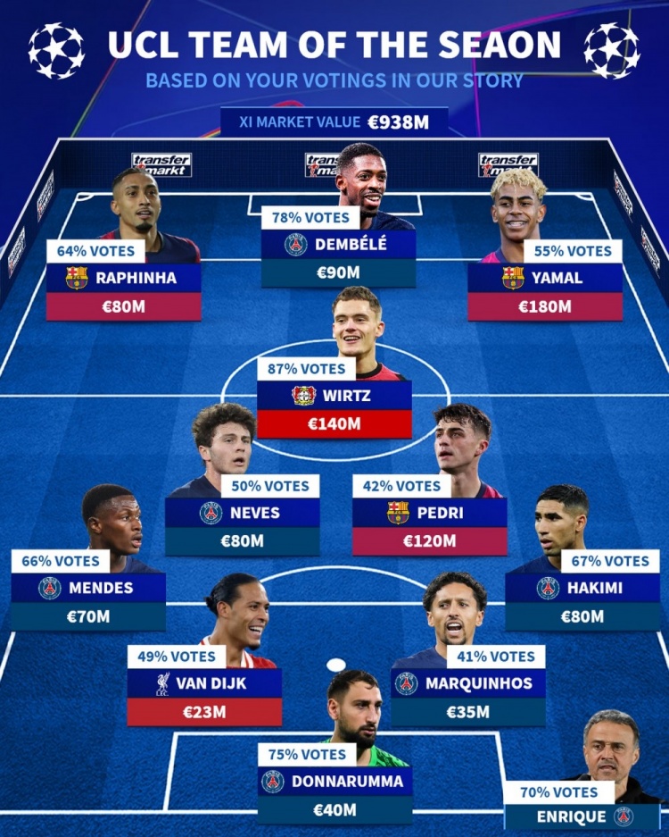 球迷票选欧冠最佳阵:登贝莱、亚马尔、维尔茨在列,主帅恩里克