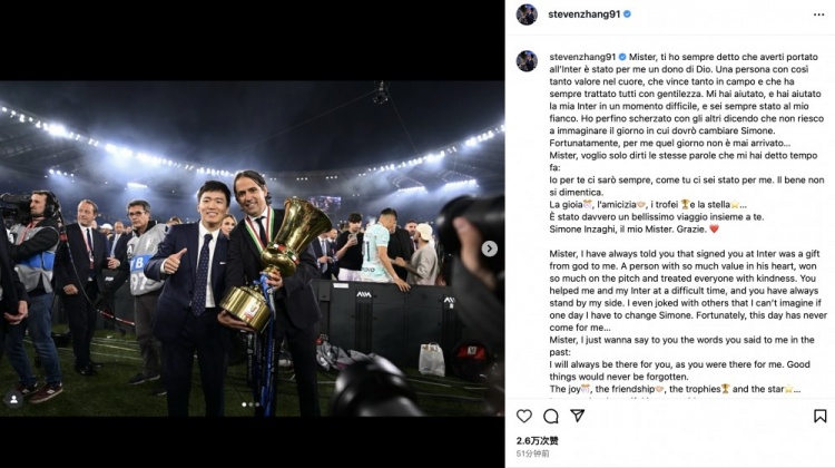 6月4日讯 国米官方宣布,主帅小因扎吉离队。前国米主席张康阳通过社交媒体发文深情告别蓝黑主帅。张康阳社媒写道:教练,我一...