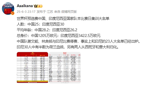世界杯预选赛中国、印度尼西亚国家队本比赛日集训大名单。人数:中国25:印度尼西亚30平均年龄:中国28.2:印度尼西亚2...