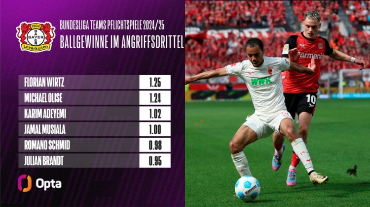 24-25赛季维尔茨进攻三区平均每90分钟抢断1.25次,德甲联赛最多