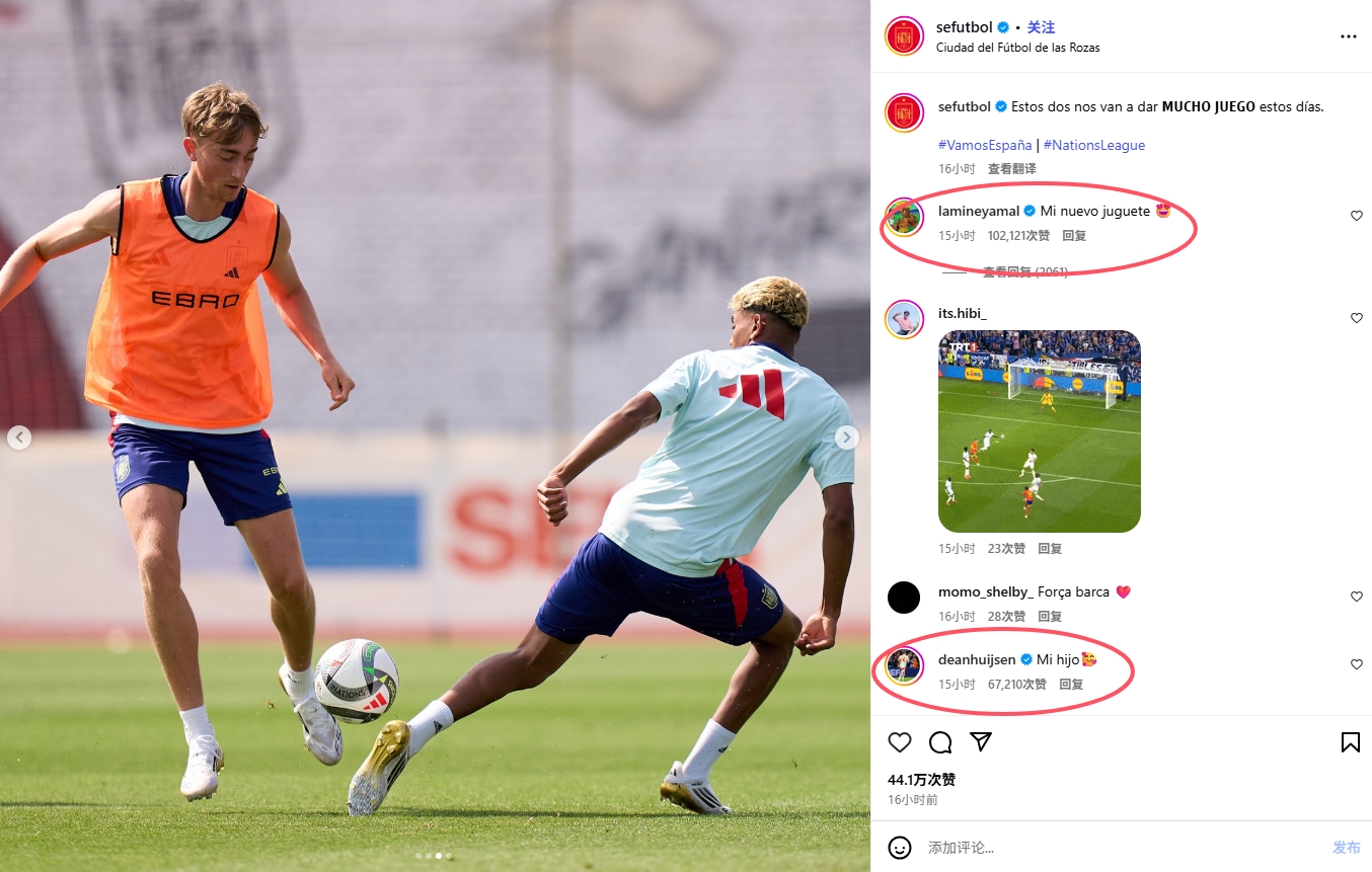 西班牙国家队社媒晒出亚马尔和怀森的训练照,评论区两人互相调侃。亚马尔:我的新玩具😍怀森:我的儿子🥰...