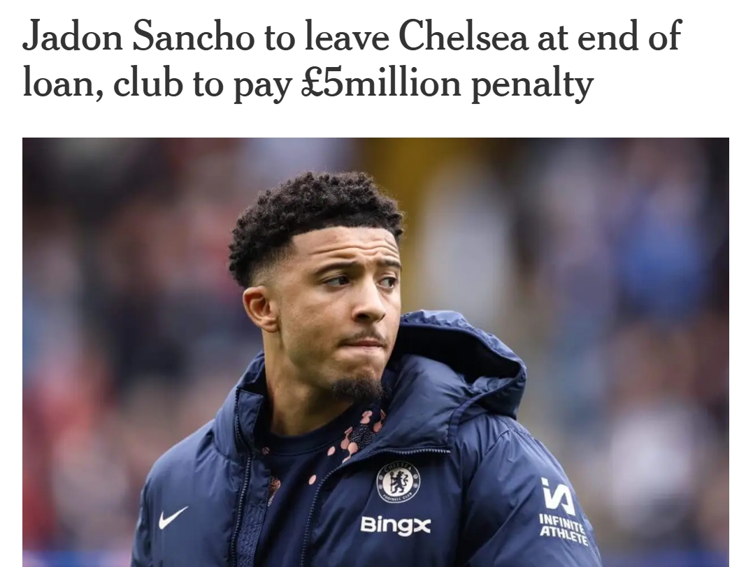 记者:切尔西没付桑乔租借费,所以500万英镑退租就当租借费了