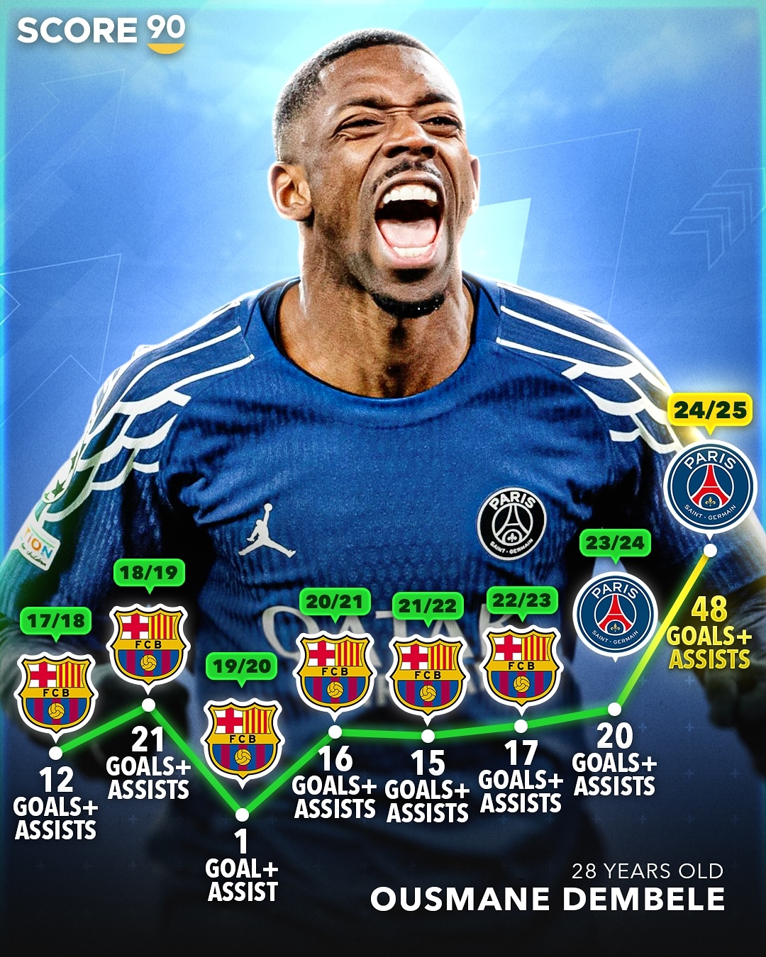 06月03日讯 24/25赛季结束,28岁登贝莱为巴黎出战49场,取得33球15助攻,夺得欧冠+法甲+法国杯+法超杯,荣...