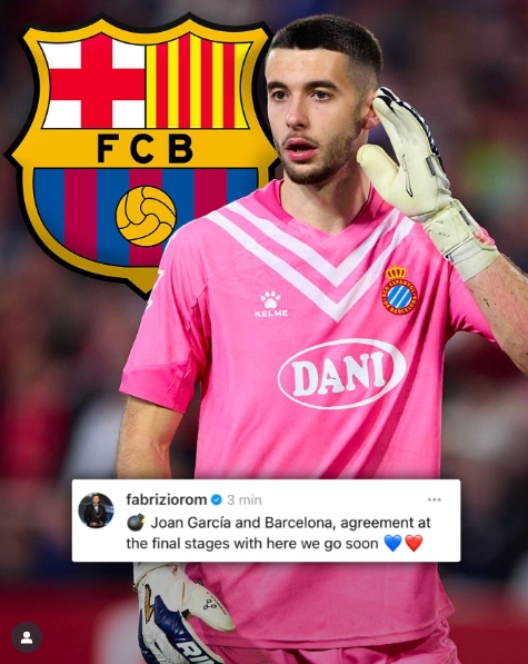 06月03日讯 据知名记者罗马诺消息,西班牙人门将霍安-加西亚即将加盟巴萨,Here we go马上到来。罗马诺表示,霍...