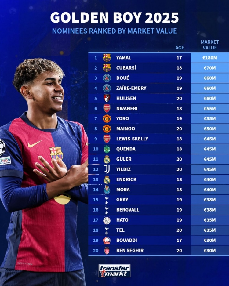 德转列金童奖候选身价榜:亚马尔1.8亿欧居首,库巴西、杜埃前三