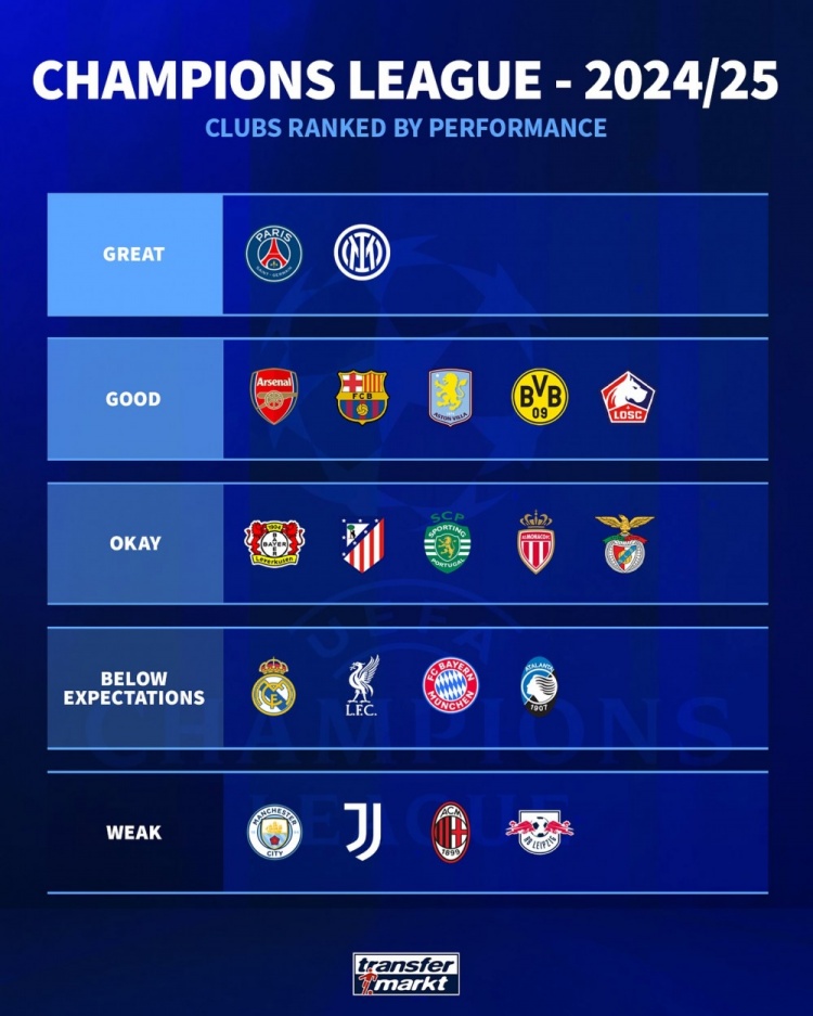 6月3日讯 德国转会市场评估了各队本赛季欧冠的表现,并列出级别,巴黎、国米表现杰出,阿森纳、巴萨、维拉、多特、里尔优秀。...