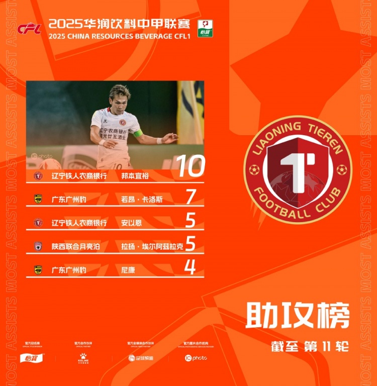 中甲助攻榜:邦本宜裕继续稳居头名,两名外援冲进前五位