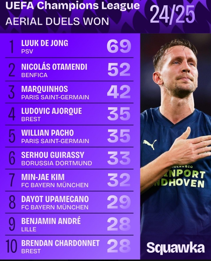 2024-25赛季欧冠高空球争抢榜:卢克-德容69次居首,奥塔门迪次之