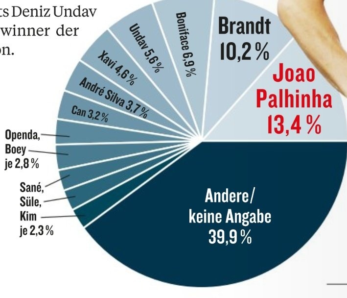 6月2日讯 德国媒体《踢球者》组织票选本赛季最失败球员,216名德甲球员参与投票,帕利尼亚获得13.4%选票,布兰特获得...