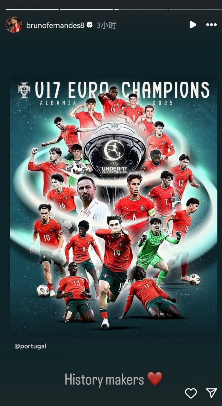 B费社媒转发海报祝贺葡萄牙U17夺冠:历史缔造者🧡