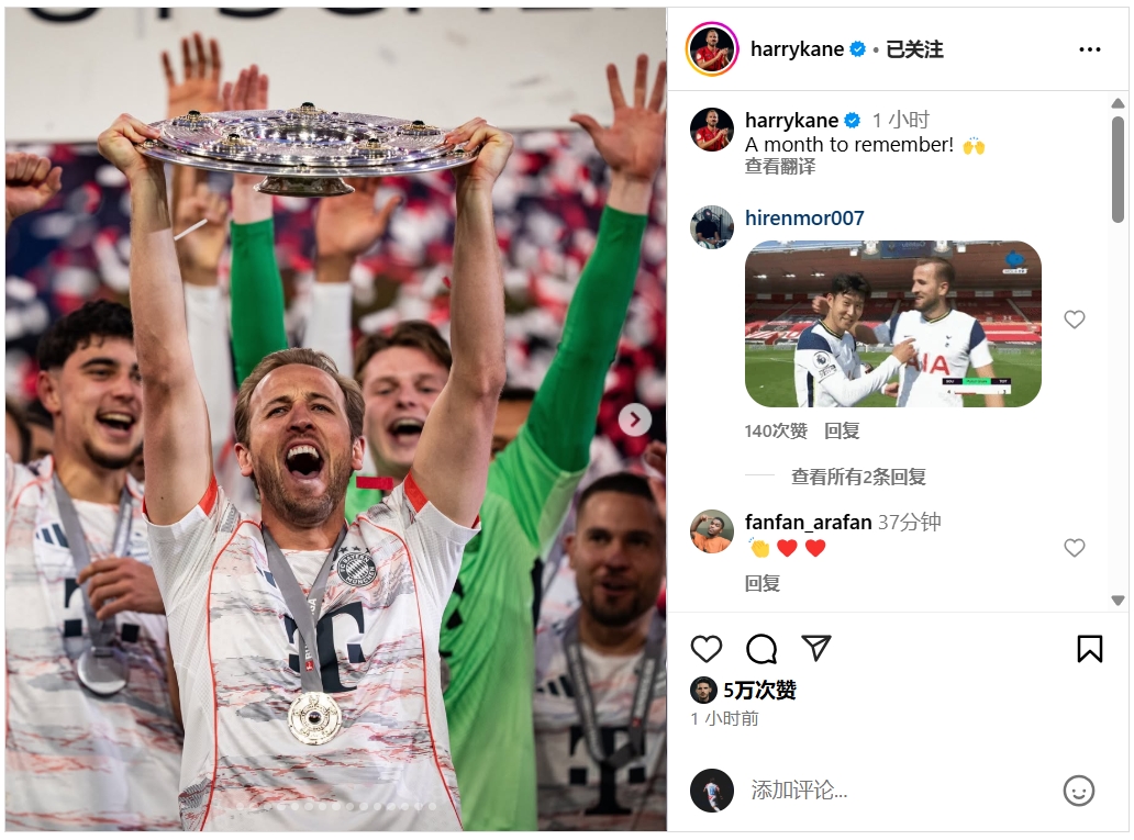 😆持续兴奋!凯恩再发文庆祝首冠:难忘的一个月!