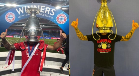 06月01日讯 巴黎夺得本赛季欧冠冠军。赛后巴黎后卫卢卡斯-埃尔南德斯将奖杯扣在头上,复刻了5年前随拜仁夺欧冠时的场景。...