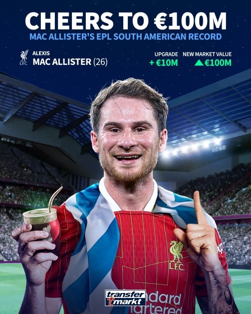 5月31日讯 德转昨日更新英超球员身价,利物浦中场麦卡利斯特身价达到1亿欧。据德转统计,这也是英超历史上身价最高的南美球...