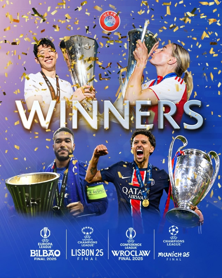 6月1日讯 欧冠决赛,巴黎5比0大胜国米,队史首次问鼎大耳朵杯。至此,欧足联旗下四大赛事冠军已尘埃落定。欧足联官方社媒祝...