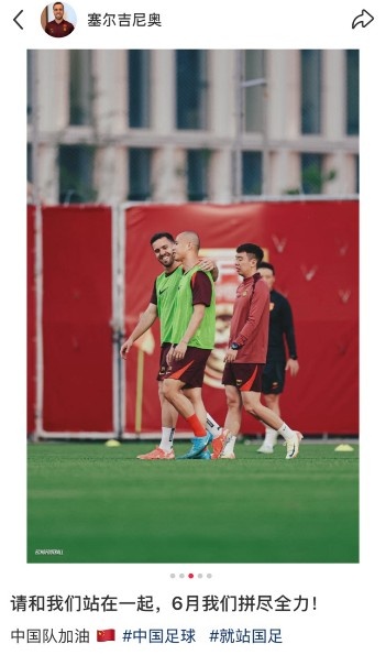 5月31日讯 今天,塞尔吉尼奥更新社媒,呼吁大家一起为国足加油。6月5日和10日,国足将分别在18强赛最后两轮客场对阵印...