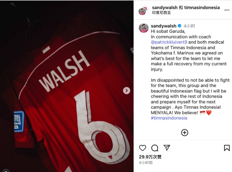5月31日讯 印尼归化国脚沃尔什今日在社媒发文,宣布自己因伤将退出本期印尼国家队大名单,他将无缘接下来与国足和日本队的比...
