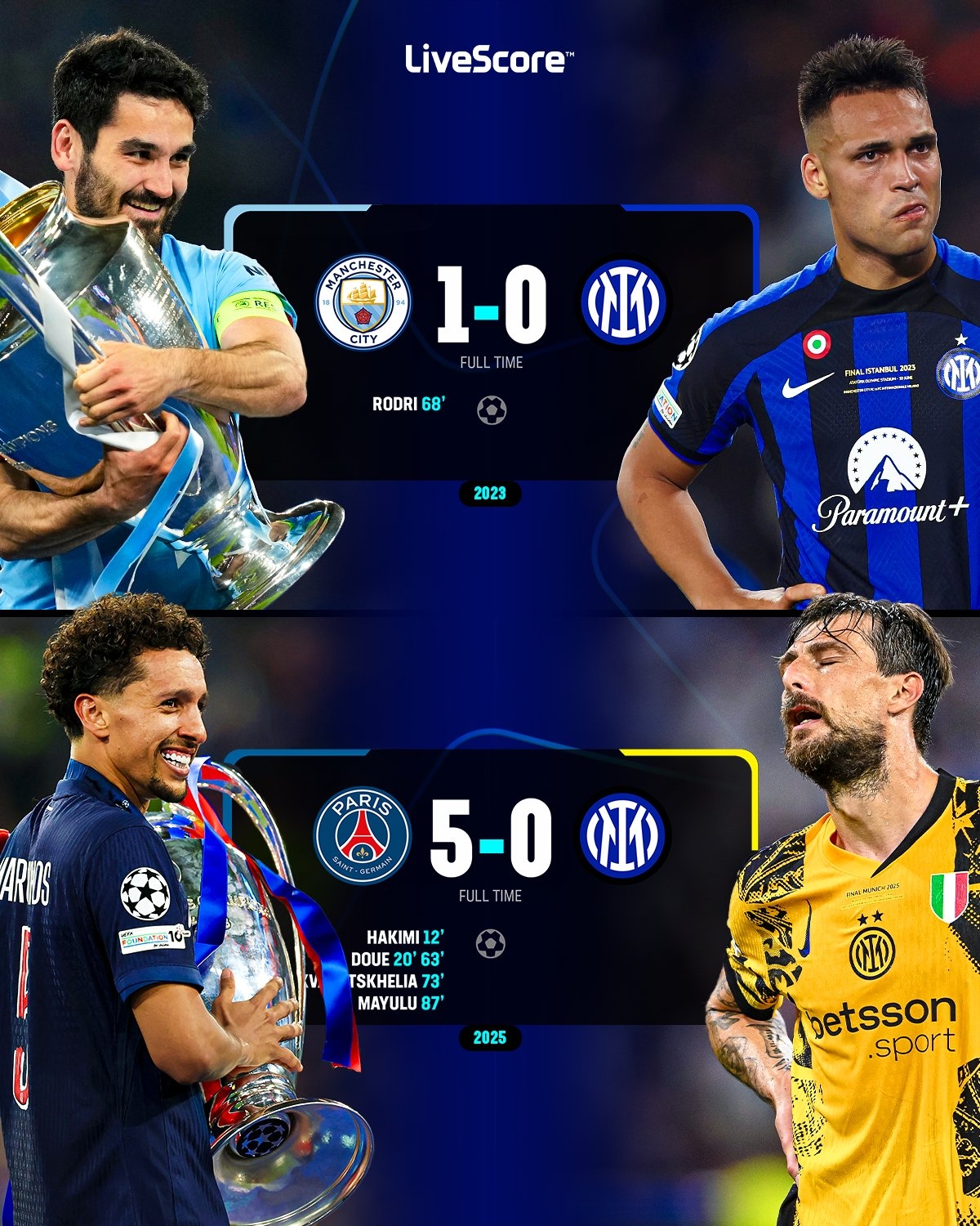 昨日重现😨国米3年2进欧冠决赛 见证曼城和巴黎圆梦&加冕三冠王