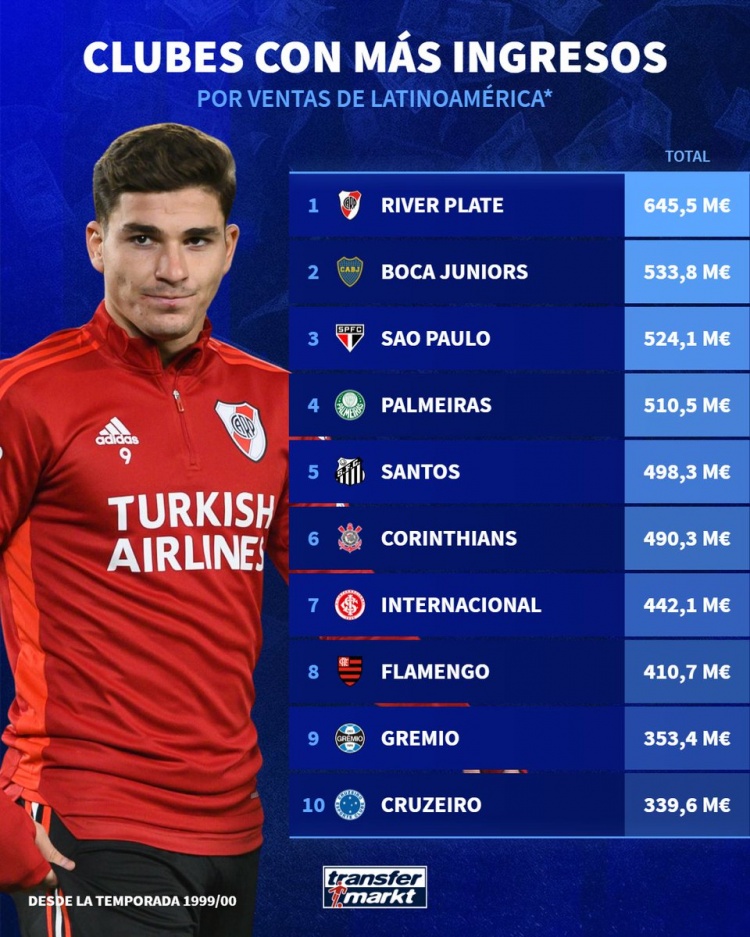 6.455亿欧!河床名列南美俱乐部出售球员收入排名榜首