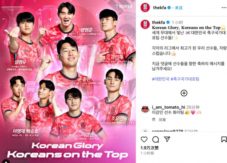 孙兴慜居C位!韩足协晒海报:韩国荣耀,夺得冠军的韩国国脚们