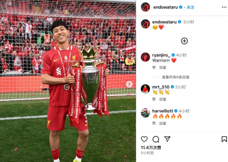 红军生涯首次随队问鼎联赛,远藤航社媒晒主场捧杯庆祝照