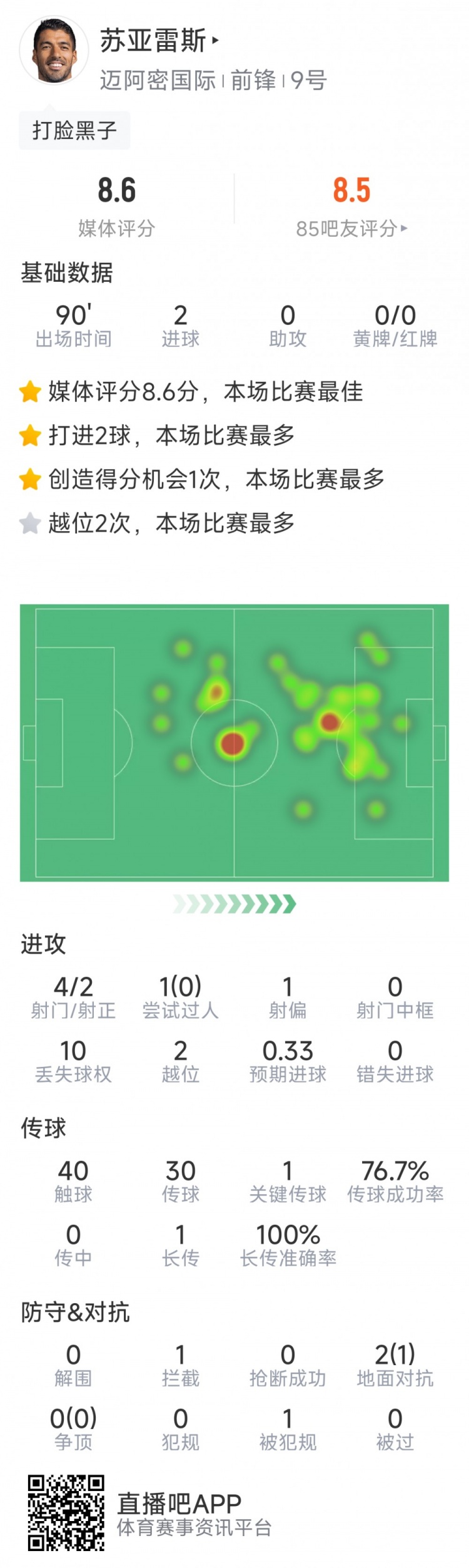 苏亚雷斯本场数据:梅开二度,4射2正,1次关键传球,评分8.6分
